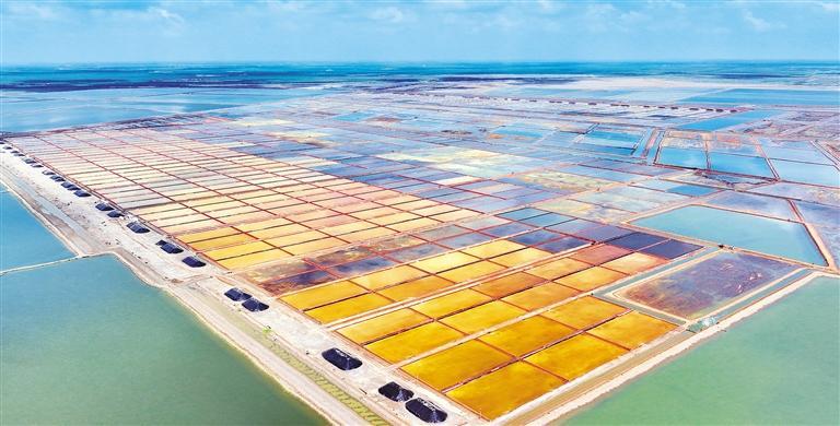 8月10日,山东省东营市,纵横排列的盐田因矿物质浓度变化呈现出不同的色彩,宛如一块调色板,美不胜收。