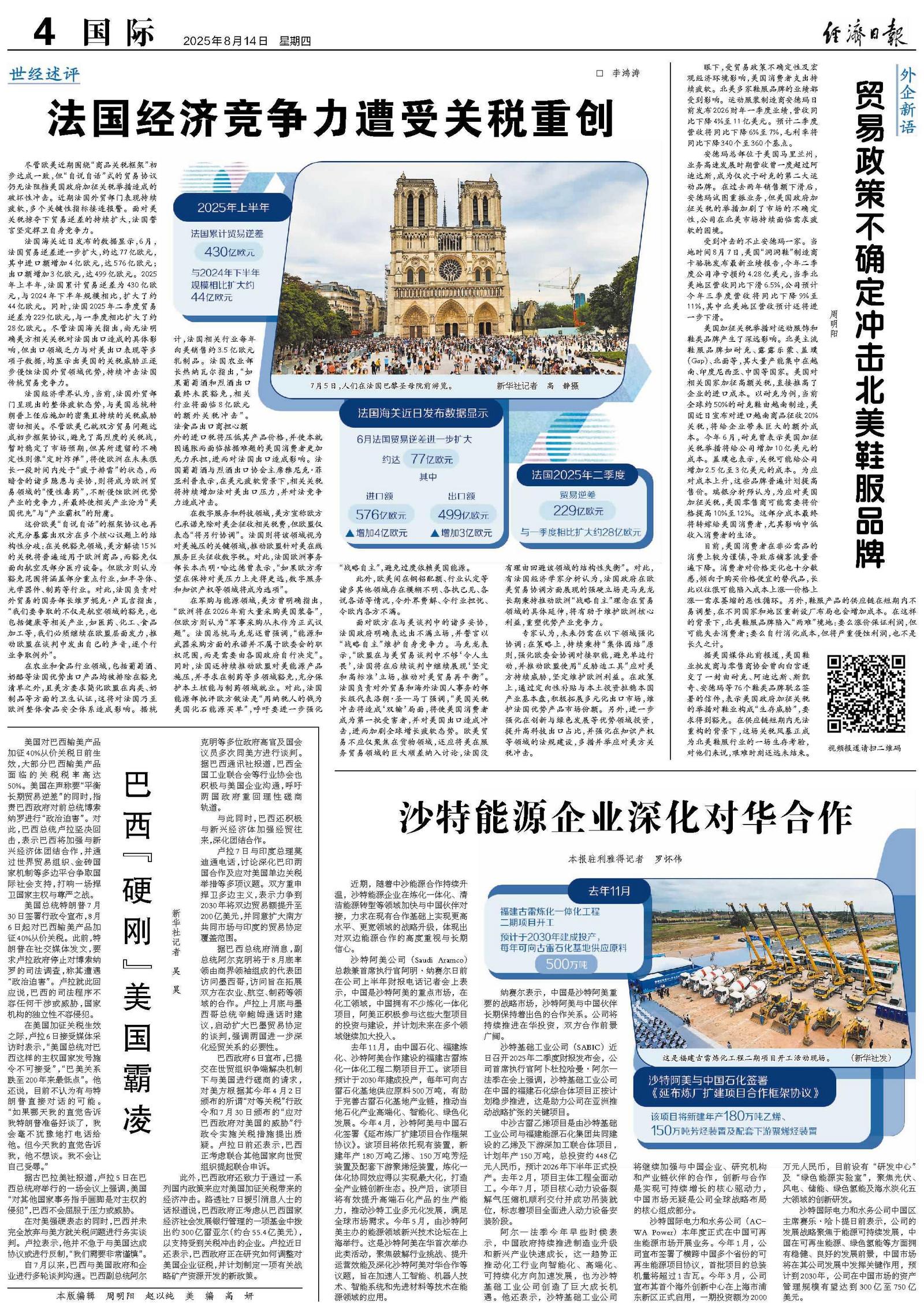 尽管欧美近期围绕“商品关税框架”初步达成一致,但“自说自话”式的贸易协议仍无法阻挡美国政府加征关税举措造成的破坏性冲击。近期法国外贸部门表现持续疲软,多个关键性指标接连报警。面对美关税掠夺下贸易逆差的持续扩大,法国誓言坚定捍卫自身竞争力。