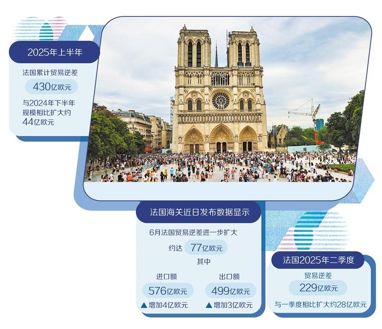 法国海关近日发布的数据显示,6月,法国贸易逆差进一步扩大,约达77亿欧元,其中进口额增加4亿欧元,达576亿欧元;出口额增加3亿欧元,达499亿欧元。2025年上半年,法国累计贸易逆差为430亿欧元,与2024年下半年规模相比,扩大了约44亿欧元。同时,法国2025年二季度贸易逆差为229亿欧元,与一季度相比扩大了约28亿欧元。尽管法国海关指出,尚无法明确美方相关关税对法国出口造成的具体影响,但出口领域乏力与对美出口表现等多项子数据,均显示出美国的关税威胁正逐步侵蚀法国外贸领域优势,持续冲击法国传统贸易竞争力。