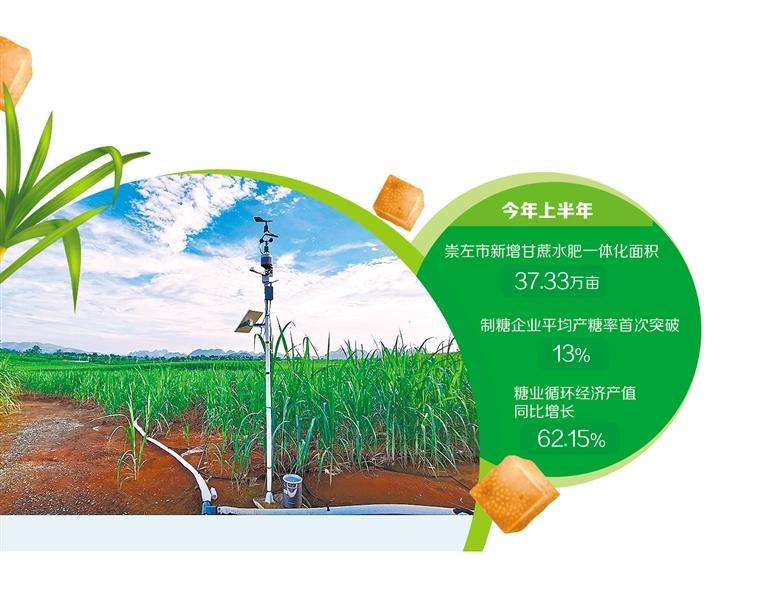 一根甘蔗“吃干榨尽”,崇左的制糖企业如今能用甘蔗生产出糖、纸、酵母、酒精、生物肥、注射级蔗糖等产品。从一根甘蔗到全产业链增值,崇左“甜蜜事业”甜蜜指数持续攀升,“糖罐子”端得越来越稳。今年上半年,崇左市新增甘蔗水肥一体化面积37.33万亩,与越南开展跨境合作种蔗面积3.72万亩,制糖企业平均产糖率首次突破13%,糖业循环经济产值同比增长62.15%,原料蔗入榨量、产糖量连续22个榨季位居全国地级市首位。