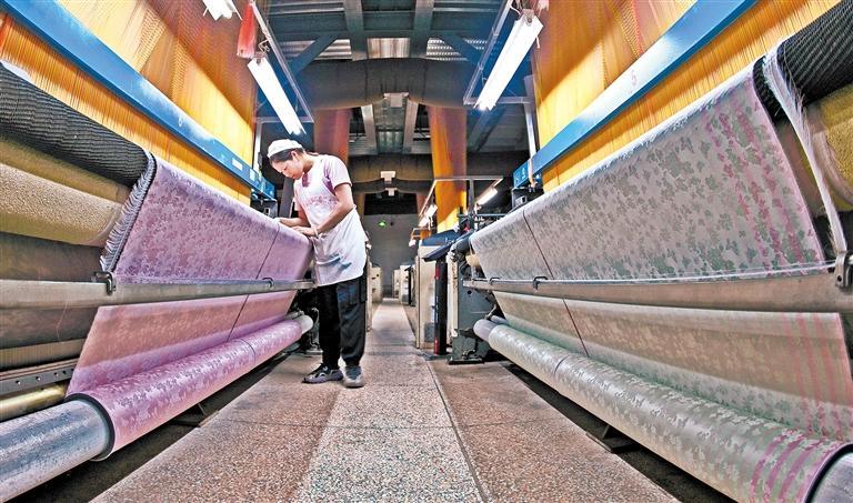 江苏海安市的海安县鑫缘丝绸有限公司织造车间内,纺织工人在操作智能提花机生产真丝坯绸。 顾华夏摄(中经视觉)