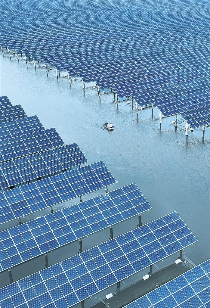 8月18日,江苏省徐州市沛县一座光伏基地内,成片光伏板整齐排列。当地引入“渔光互补”项目,在采煤沉降区发展光伏产业,实现了生态效益与经济效益双丰收。刘彭瑀摄(中经视觉)