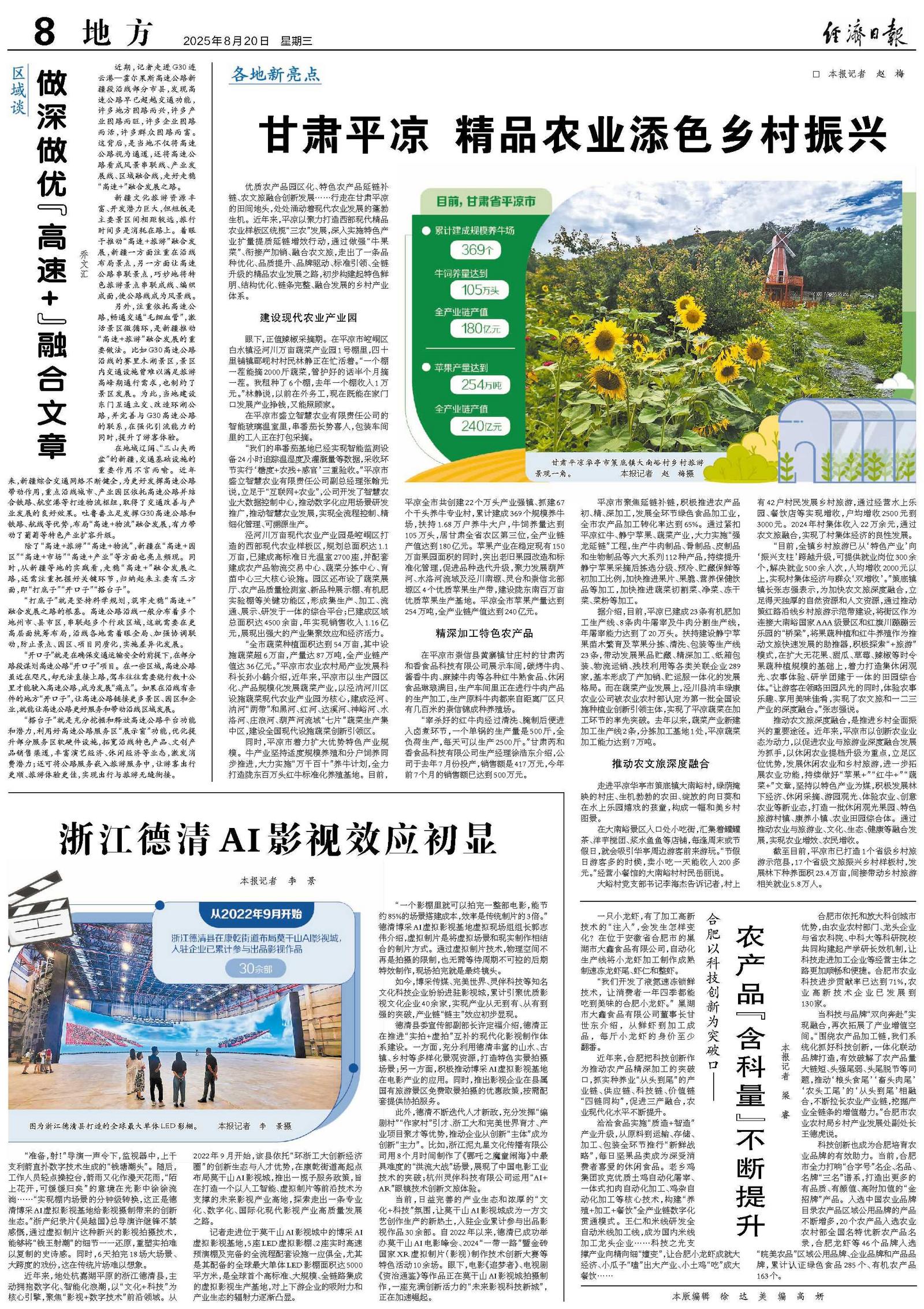 优质农产品园区化、特色农产品延链补链、农文旅融合创新发展……行走在甘肃平凉的田间地头,处处涌动着现代农业发展的蓬勃生机。近年来,平凉以聚力打造西部现代精品农业样板区统揽“三农”发展,深入实施特色产业扩量提质延链增效行动,通过做强“牛果菜”、衔接产加销、融合农文旅,走出了一条品种优化、品质提升、品牌驱动、标准引领、全链升级的精品农业发展之路,初步构建起特色鲜明、结构优化、链条完整、融合发展的乡村产业体系。