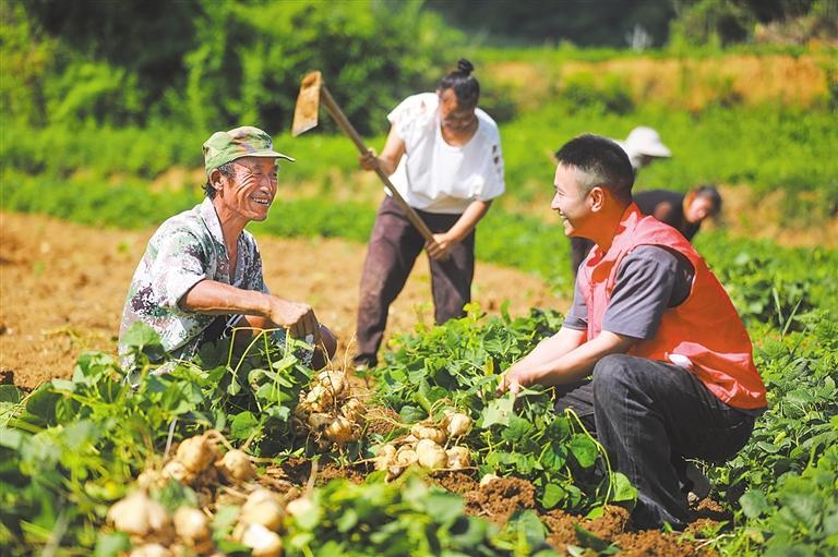 8月18日,贵州省黔西市莲城街道坪子社区水果地瓜种植基地,志愿者帮助社区种植户捆扎地瓜。近年来,贵州省黔西市着力发展都市型现代农业,发展1000多亩水果地瓜种植示范基地,并聘请农业专家予以指导,提升产品品质,帮农户增收。周训超摄(中经视觉)