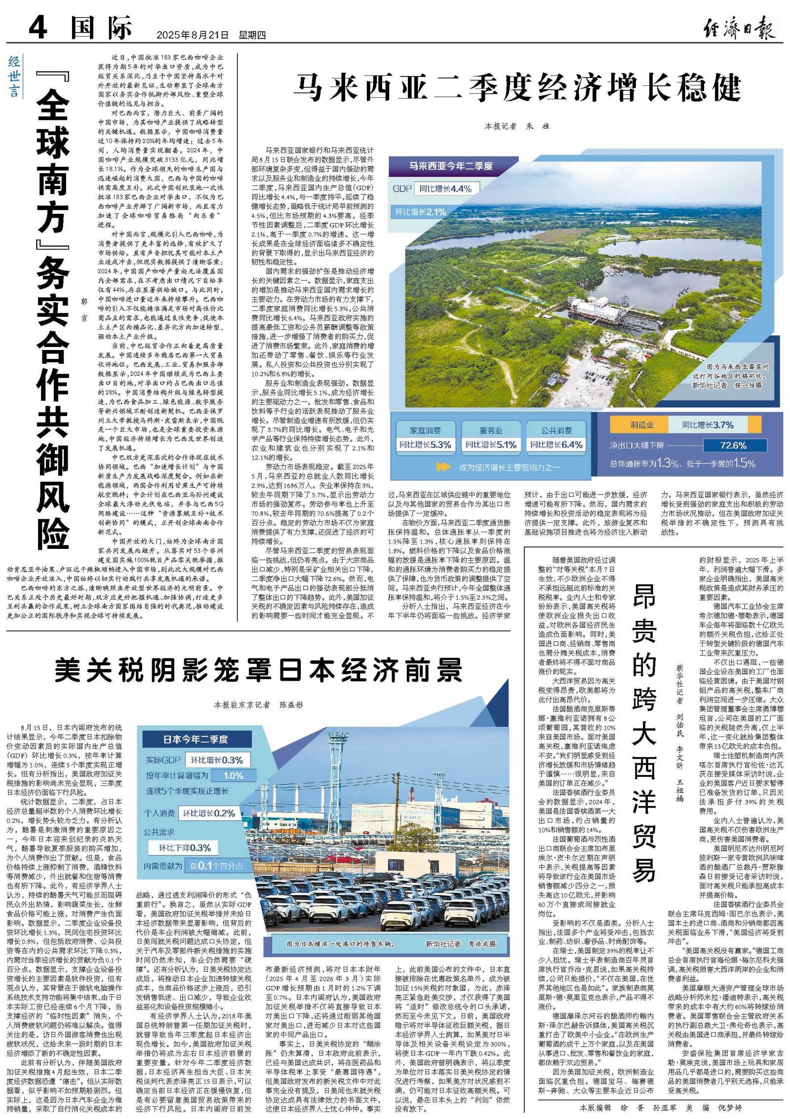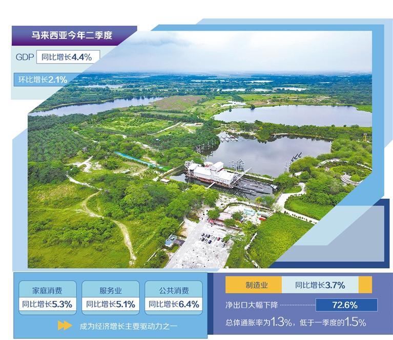 马来西亚国家银行和马来西亚统计局8月15日联合发布的数据显示,尽管外部环境复杂多变,但得益于国内强劲的需求以及服务业和制造业的持续增长,今年二季度,马来西亚国内生产总值(GDP)同比增长4.4%,与一季度持平,延续了稳健增长态势,虽略低于统计局早前预测的4.5%,但比市场预期的4.3%要高。经季节性因素调整后,二季度GDP环比增长2.1%,高于一季度0.7%的增速。这一增长成果是在全球经济面临诸多不确定性的背景下取得的,显示出马来西亚经济的韧性和稳定性。
