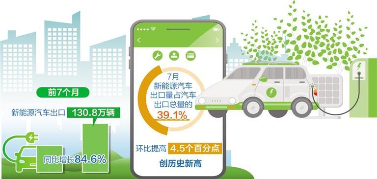 值得一提的是,新能源汽车出口数量增长明显。前7个月,新能源汽车出口130.8万辆,同比增长84.6%,成为外贸增长的亮点。