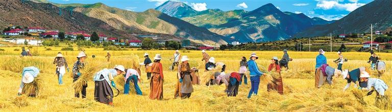 昌都市洛隆县群众在收割青稞。近年来,西藏粮食产量稳步增长。2024年粮食总产量比1965年增长2.9倍,连续10年稳定在100万吨以上(摄于2024年9月)。