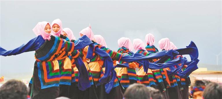 那曲市一年一度的赛马节上,牧民在表演舞蹈。2012年以来,国家累计投资48.9亿元用于西藏公共文化建设,基本形成了五级公共文化设施网络;西藏各级公共文化机构年均开展文化惠民活动10万余场次,受益群众近1500万人次(摄于2024年8月)。