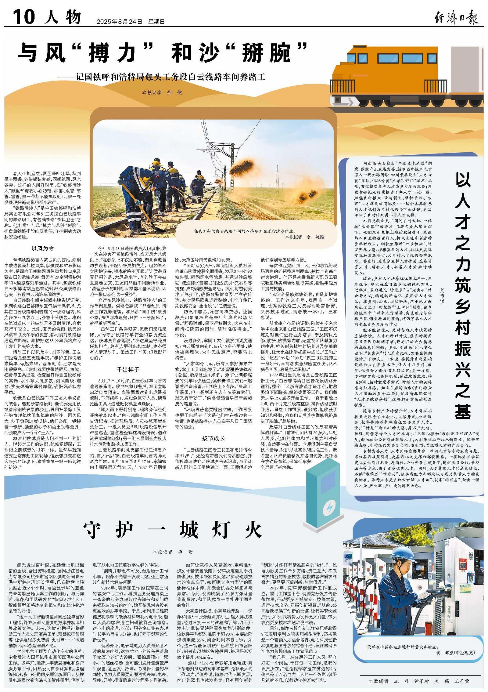 “铁路清沙人”是中国铁路呼和浩特局集团有限公司包头工务段白云线路车间的养路职工,有包满铁路“铁轨卫士”之称。他们常年与风“搏力”、和沙“掰腕”,担负着铁路排险维修重任,守护钢铁大动脉安全畅通。
