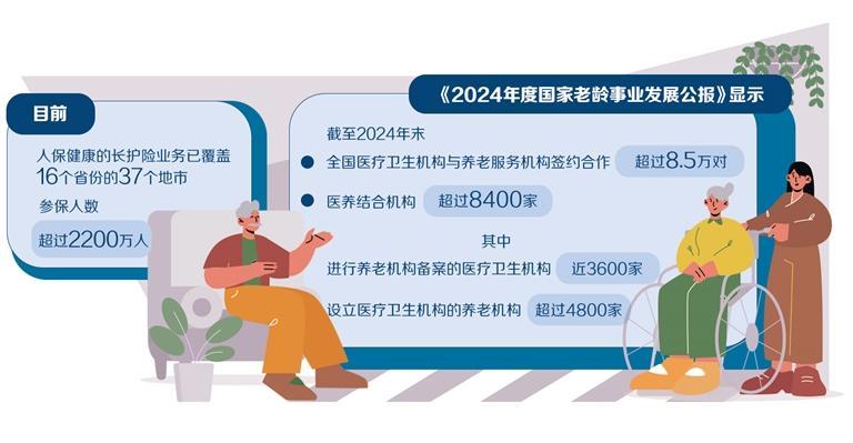 《2024年度国家老龄事业发展公报》显示,截至2024年末,全国医疗卫生机构与养老服务机构签约合作超过8.5万对,医养结合机构超过8400家,其中进行养老机构备案的医疗卫生机构近3600家,设立医疗卫生机构的养老机构超过4800家,床位总数超过210万张。
