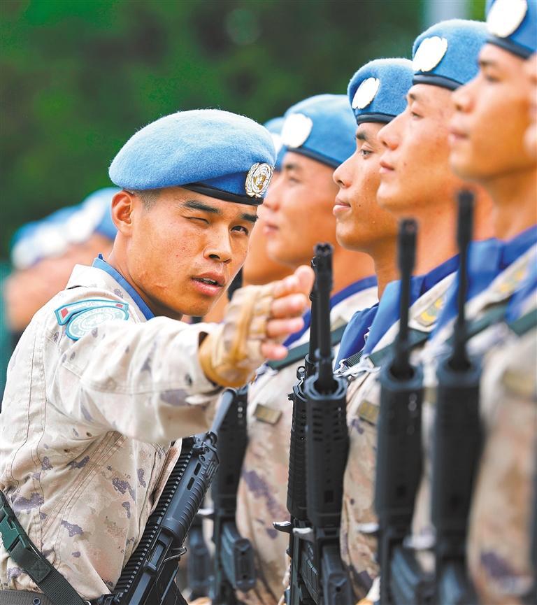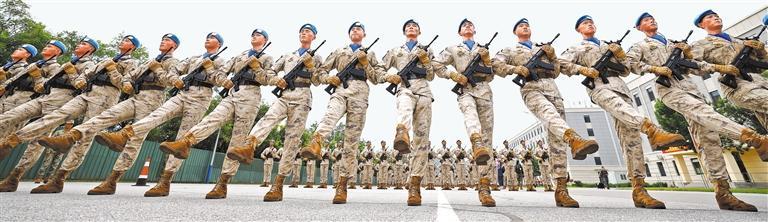 8月12日,维和部队方队在紧张有序地训练。官兵们整齐划一地做出规定动作,姿势标准、精神抖擞。