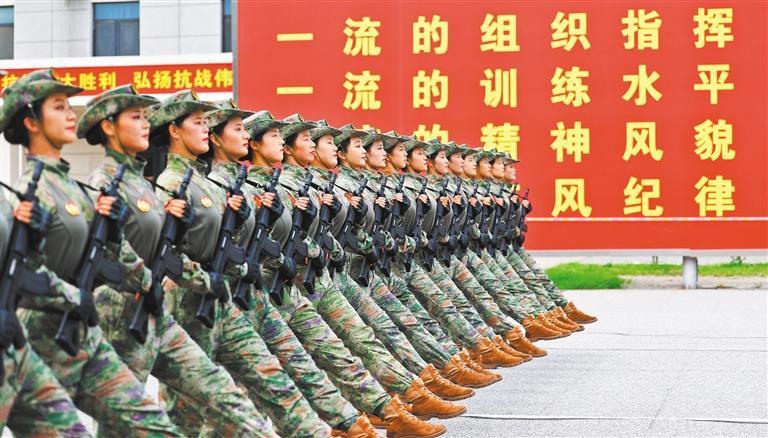 8月12日,民兵方队在训练。民兵方队人员来自15个省份,覆盖抗战时期党领导的主要抗日根据地,是今年阅兵场上唯一一个全女兵方队。