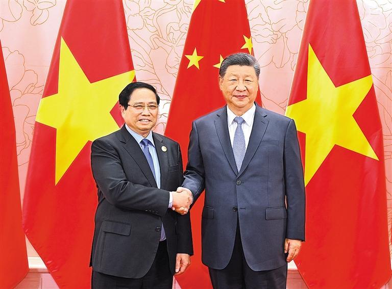 习近平指出,我今年4月对越南进行国事访问,双方就新形势下推进中越命运共同体建设达成重要共识。两国各部门各地方要加紧落实,推动中越全面战略合作取得更多实质性成果。面对加速演进的百年变局和变乱交织的国际形势,中越要坚定道路自信和制度自信,加强团结协作,推动中越命运共同体航船始终沿着正确方向稳步前行。