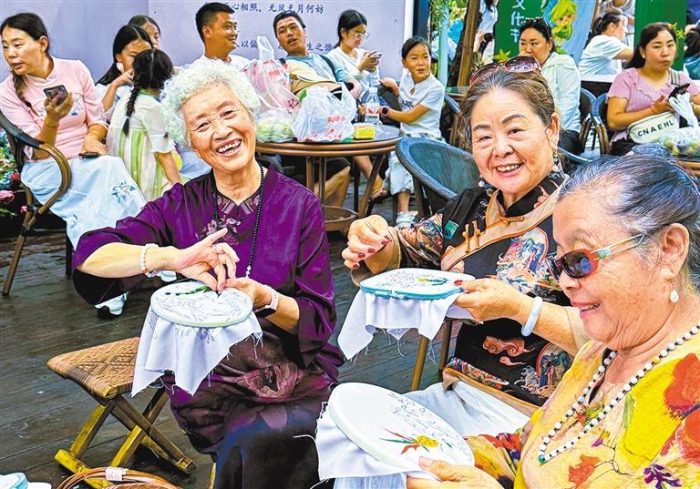 7月19日,广南县杨柳井乡六郎城村,游客在体验传统刺绣。该村立足石斛资源优势,丰富旅游旅居业态。李念琴摄(中经视觉)