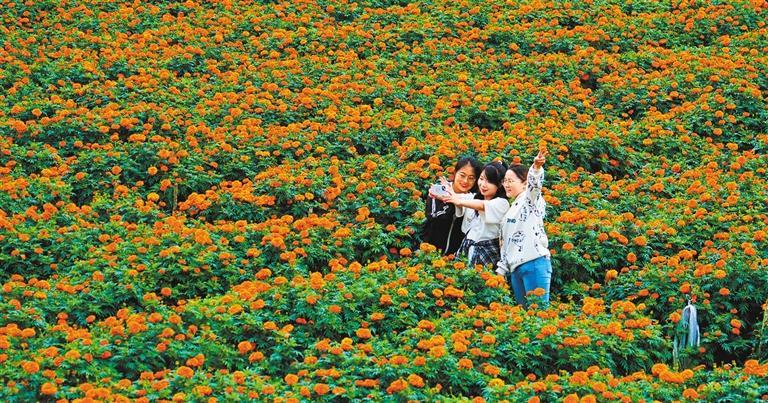 7月25日,文山市平坝镇,游客在万寿菊花海中观赏拍照。当地立足资源特色,创新丰富旅游产品,带动文旅消费。王发和摄(中经视觉)