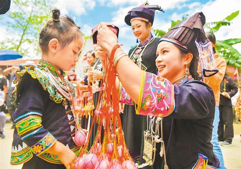 6月28日,马关县马白镇马洒村“锦壮红饭节”庆祝活动上,工作人员为小朋友戴上寓意好彩头的彩色鸡蛋。查宇波摄(中经视觉)