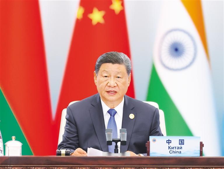 习近平强调,上海合作组织在成立宣言和组织宪章中开宗明义指出,要推动国际政治经济秩序朝着更加民主、公正、合理的方向发展。24年来,组织秉持互信、互利、平等、协商、尊重多样文明、谋求共同发展的“上海精神”,坚持地区事务共商、平台机制共建、合作成果共享,提出并实施许多全球治理新理念,日益成为全球治理体系建设和改革的积极推动力量。面对加速演进的世界百年未有之大变局,上海合作组织要发挥引领作用,为维护世界和平稳定贡献“上合力量”,为推动全球开放合作展现“上合担当”,为弘扬全人类共同价值作出“上合示范”,为捍卫国际公平正义采取“上合行动”,当好践行全球治理倡议的表率。