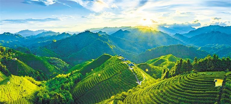 8月31日早晨,广西金秀瑶族自治县金秀镇六段村一个高山茶园,初升的太阳“点亮”连绵的茶垄。近年来,当地打造“茶+文旅+研学”新业态,积极发展特色旅游。黄胜林摄(中经视觉)