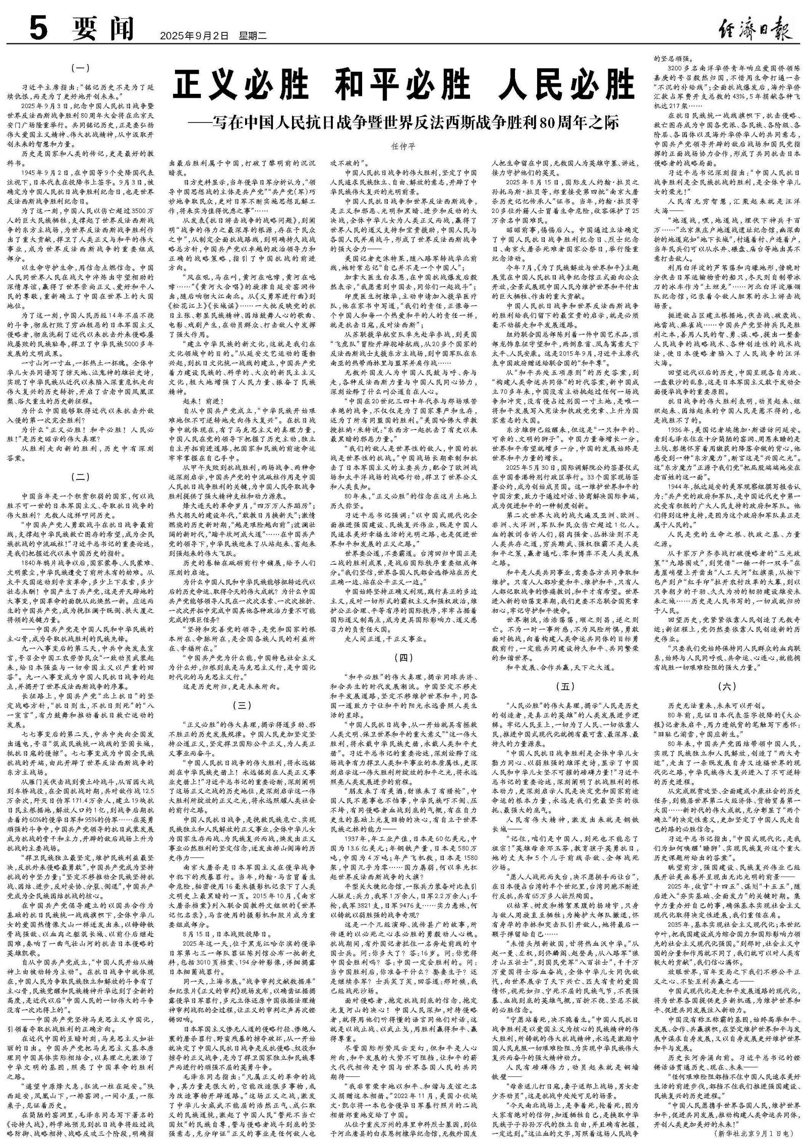 “正义必胜”的伟大真理,揭示得道多助、邪不胜正的历史发展规律。中国人民更加坚定坚持公道正义,坚定捍卫国际公平正义,为人类正义事业而奋斗。