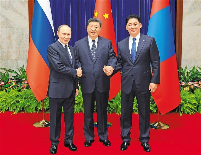 普京表示,俄中蒙是友好邻邦,有着悠久合作传统。增进政治互信很重要,有利于夯实三方关系基础。俄方愿同中、蒙开展平等互利、面向未来的战略合作,使三方合作同双边合作相互补充、相互促进。三方要密切发展战略对接,加强互联互通,扩大贸易和投资规模,深化金融、能源、数字经济、教育、环保、旅游等领域合作交流,助力各自经济发展,促进区域经济融合,增进民心相通。