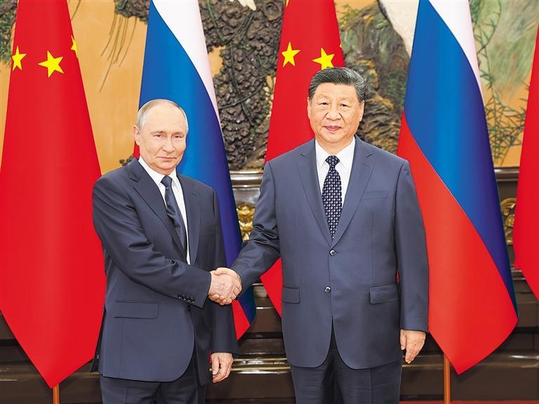 习近平指出,中俄两国元首相互出席对方国家举办的纪念世界反法西斯战争胜利庆典,充分彰显了作为第二次世界大战主要战胜国和联合国安理会常任理事国的大国担当,展示了维护二战胜利成果、捍卫正确二战史观的坚定决心。我提出全球治理倡议,就是要会同所有志同道合国家,坚定捍卫联合国宪章宗旨和原则,推动建设更加公正合理的全球治理体系。中俄两国都强调主权平等、国际法治、多边主义,要继续在联合国、上海合作组织、金砖国家、二十国集团等多边平台加强协作,携手推动构建人类命运共同体。