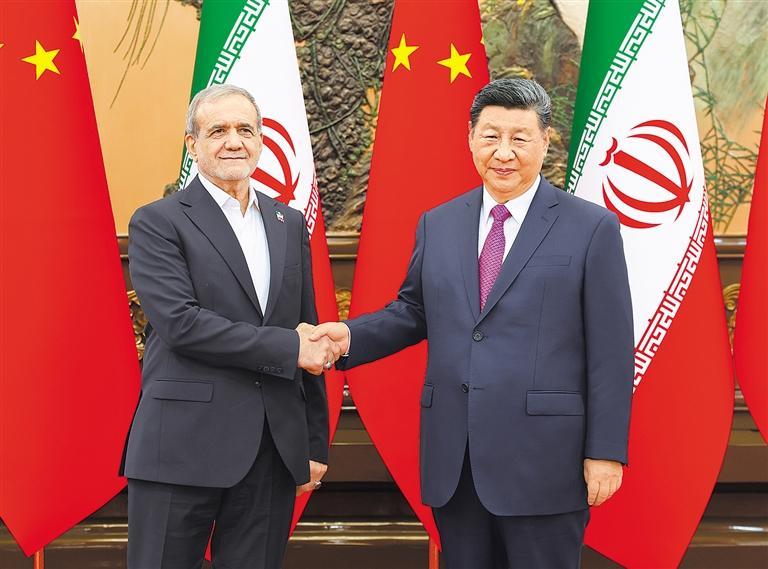 习近平指出,中伊关系经受住国际风云变幻考验,保持平稳健康发展。去年我们在喀山会晤后,两国各部门积极落实双方达成的重要共识,中伊各领域合作取得不少新成果。中方始终把发展对伊关系置于中国中东外交重要位置,愿同伊方赓续友好,深化互信,加强在贸易、投资、清洁能源、互联互通等领域合作,增进人文交往,携手推动中伊全面战略伙伴关系行稳致远。中方提出全球治理倡议,愿同包括伊朗在内的国际社会一道,推动构建更加公正合理的全球治理体系,携手构建人类命运共同体。