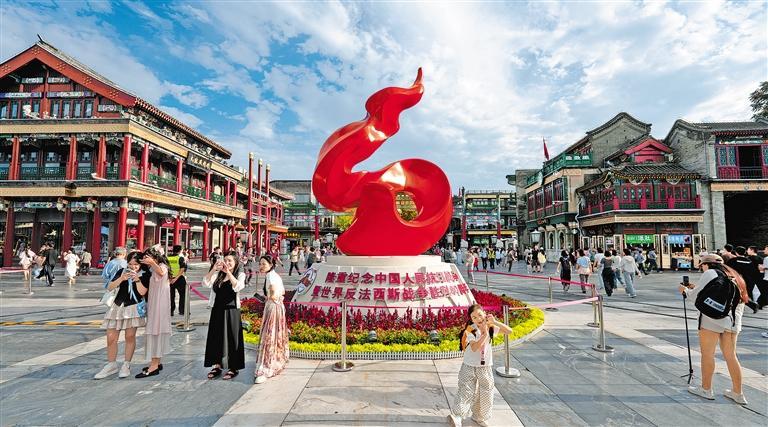 日前在前门大街北口拍摄的“万众一心”雕塑。北京市综合运用国旗红旗、立体花坛等形式进行景观布置,纪念中国人民抗日战争暨世界反法西斯战争胜利80周年。