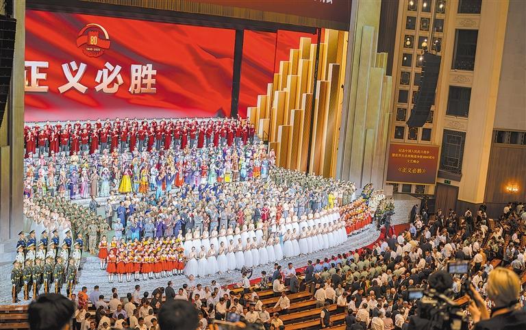 9月3日晚,北京人民大会堂灯火璀璨。盛大的阅兵仪式刚刚结束,纪念中国人民抗日战争暨世界反法西斯战争胜利80周年文艺晚会《正义必胜》隆重上演。