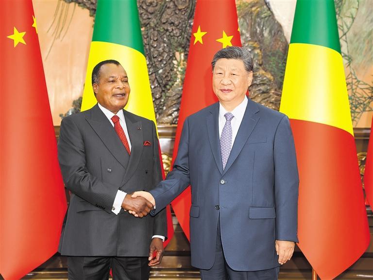 习近平强调,刚果(布)担任中非合作论坛非方共同主席国以来,同中方一道积极推动北京峰会成果落实,取得可喜成绩。中方愿同非方共同实施好“十大伙伴行动”,打造绿色产业、电子商务和支付、科技、人工智能等新增长点,推动中非合作提质升级。当前国际形势变乱交织,中国和非洲作为全球南方重要成员,要肩负起捍卫国际公平正义、维护世界和平、促进共同发展的历史责任,携手推动构建人类命运共同体。