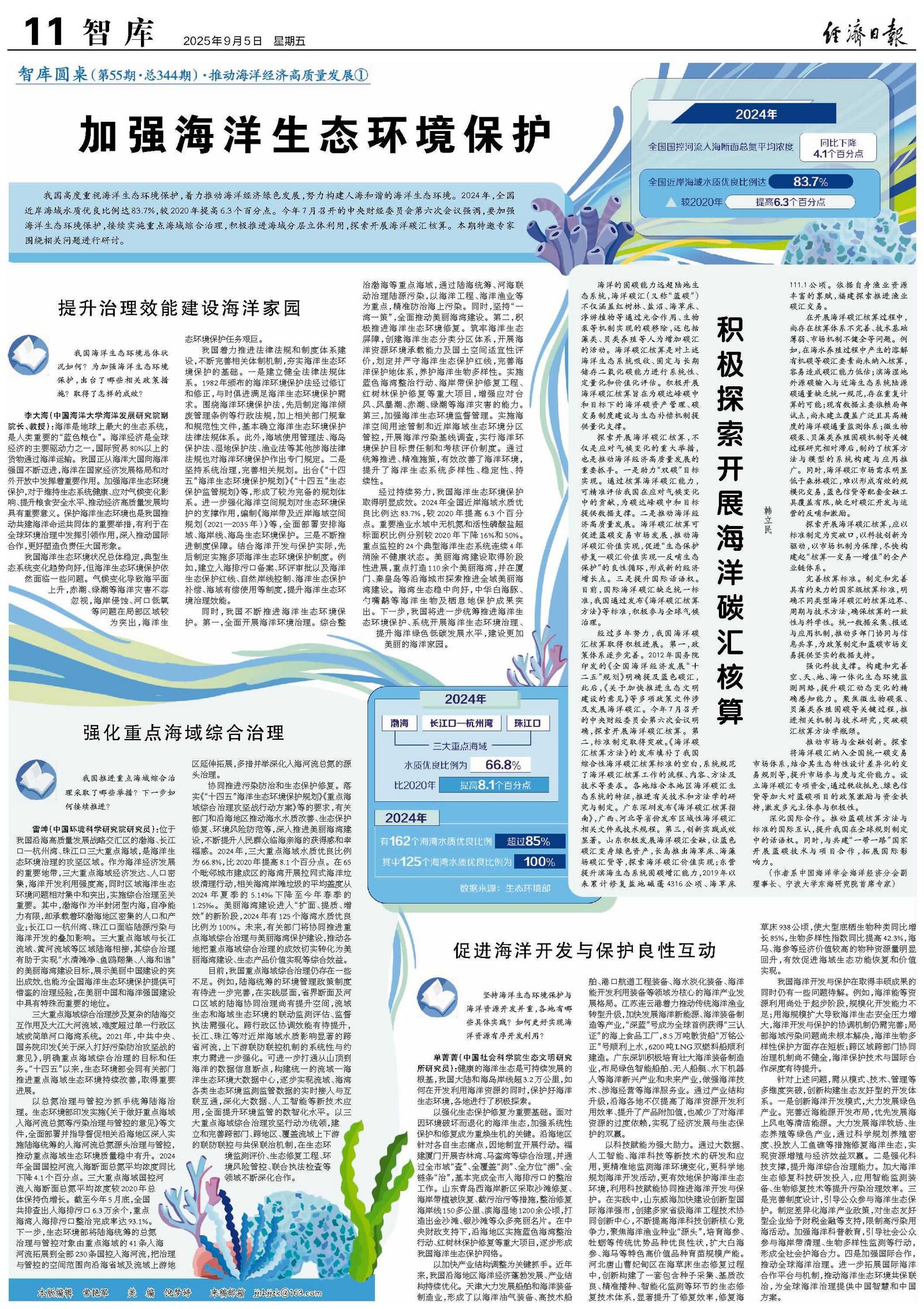 我国高度重视海洋生态环境保护,着力推动海洋经济绿色发展,努力构建人海和谐的海洋生态环境。2024年,全国近岸海域水质优良比例达83.7%,较2020年提高6.3个百分点。今年7月召开的中央财经委员会第六次会议强调,要加强海洋生态环境保护,接续实施重点海域综合治理,积极推进海域分层立体利用,探索开展海洋碳汇核算。本期特邀专家围绕相关问题进行研讨。