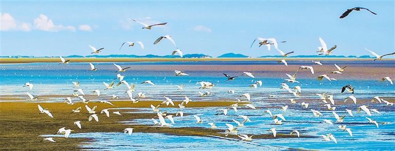 8月8日,鄱阳湖江西省九江市都昌县水域滩涂鹭鸟翔集。近年来,鄱阳湖良好的生态环境吸引越来越多的候鸟在此栖息。傅建斌摄(中经视觉)