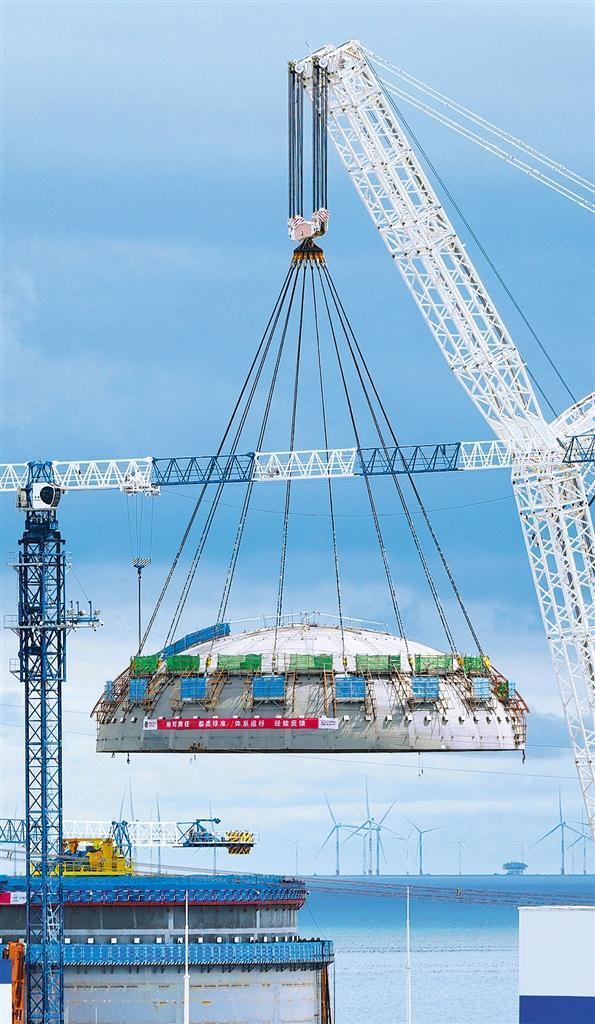 9月6日,山东海阳核电站4号机组核岛钢制安全壳顶封头模块顺利吊装就位,反应堆厂房实现封顶,标志着核岛建设将由土建施工转入设备安装阶段。唐 克摄(中经视觉)