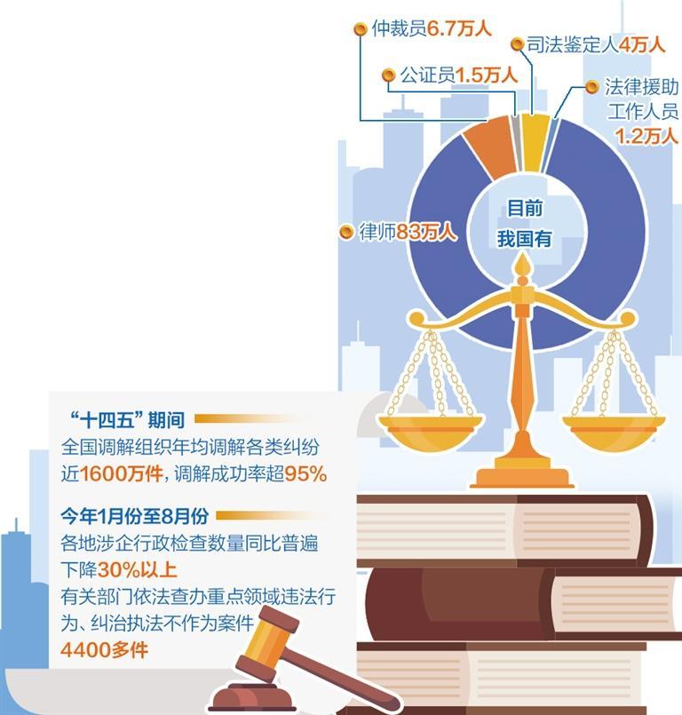 “十四五”时期,我国深入推进律师、公证、法律援助、司法鉴定、调解、仲裁等领域改革发展,覆盖城乡、便捷高效、均等普惠的公共法律服务体系基本建成并持续完善。目前,我国有律师83万人、仲裁员6.7万人、公证员1.5万人、司法鉴定人4万人、法律援助工作人员1.2万人,每年办理各类业务4000多万件,在服务经济社会高质量发展、保障群众合法权益等方面发挥了积极重要的作用。
