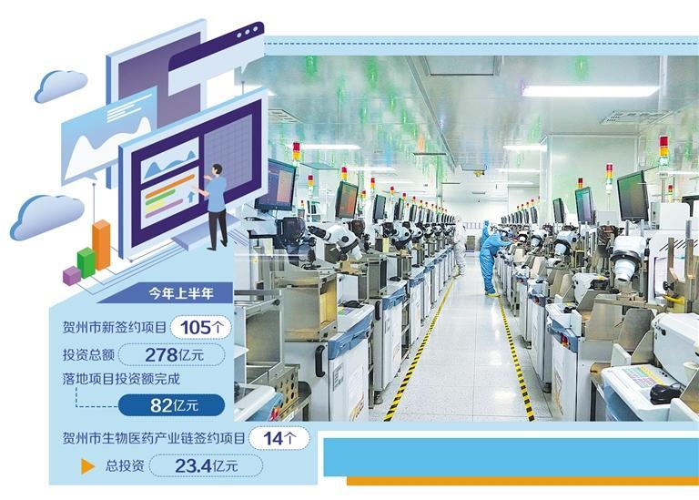 生物医药产业是贺州市着力打造的新兴产业。立足自身资源禀赋与产业基础,贺州市积极构建“研发在粤、生产在贺”的跨区域协同创新体系,通过搭建平台、帮办代办服务等举措,吸引20余家企业扎根贺州。2024年,全市生物医药产业链签约项目18个,总投资18亿元;今年上半年,签约项目14个,总投资23.4亿元。