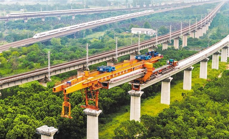 9月6日,安徽省合肥市新建上海至南京至合肥高速铁路沪宁段站前Ⅱ标施工现场,技术人员在进行预制箱梁架设作业。