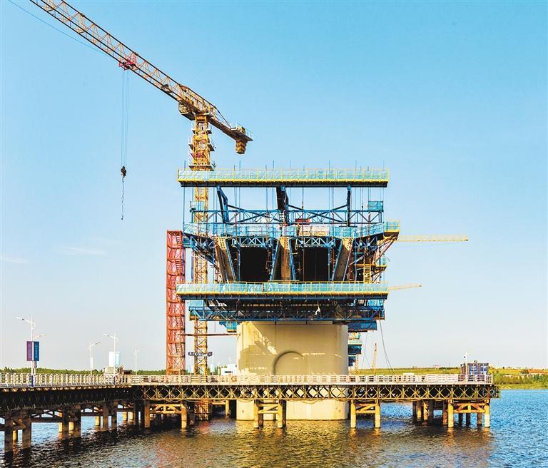 9月10日拍摄的潍宿高铁至青岛连接线五莲段墙夼水库特大桥现场。该连接线东起青岛,经潍坊诸城市、日照五莲县与新建潍宿高铁相连。
