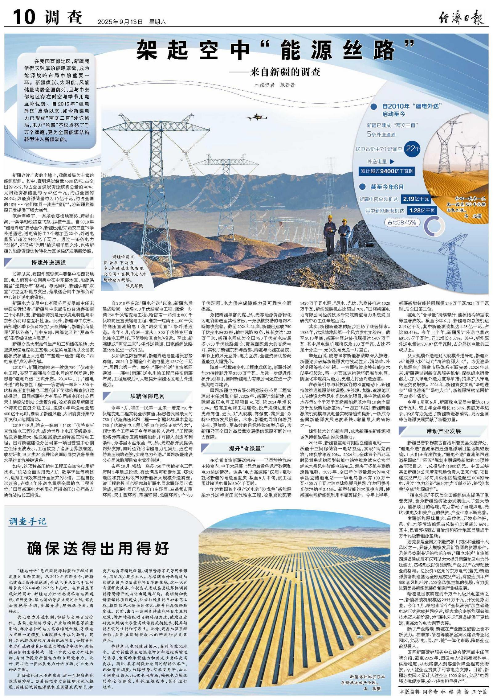 疆电的“含绿量”持续攀升,能源结构转型取得显著成效。截至今年6月,新疆电网总装机达2.19亿千瓦,其中新能源装机达1.28亿千瓦,占比58.45%。今年上半年,新疆累计外送电量达631.65亿千瓦时,同比增长6.57%。其中,新能源外送电量达207.87亿千瓦时,占总外送电量的三成以上。