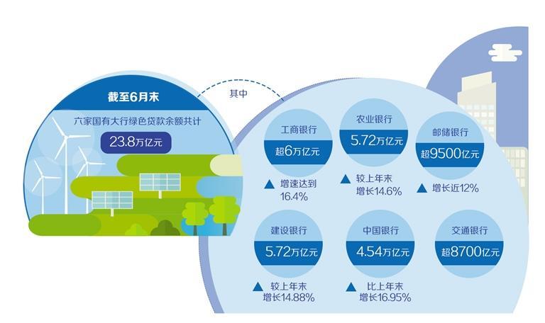 截至6月末,6家国有大行绿色贷款余额共计23.8万亿元。其中,工商银行绿色贷款余额超6万亿元,增速达到16.4%;农业银行、建设银行绿色贷款余额均为5.72万亿元,较上年末分别增长14.6%、14.88%;中国银行绿色贷款余额4.54万亿元,比上年末增长16.95%;交通银行绿色贷款余额超8700亿元;邮储银行绿色贷款余额超9500亿元,增长近12%。