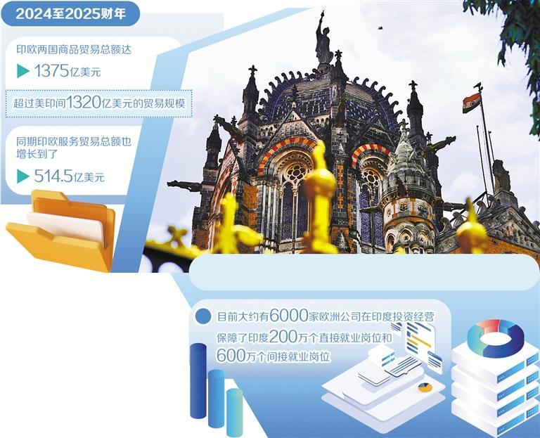 目前,欧盟已经成为印度最重要的贸易伙伴之一,达成自贸协定是双方共同诉求。数据显示,2024至2025财年,印欧两大经济体商品贸易总额达到1375亿美元,超过了美印间1320亿美元的贸易规模,同期印欧服务贸易总额也增长到了514.5亿美元。目前大约有6000家欧洲公司在印度投资经营,保障了印度200万个直接就业岗位和600万个间接就业岗位。