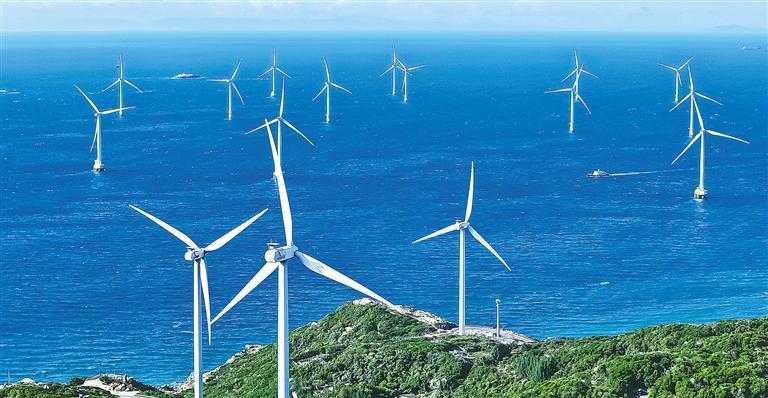 9月17日,福建平潭岛北部湾,风力发电机迎风转动。近年来,当地充分发挥海面风能资源丰富的优势,大力发展风电产业,统筹发电、供电企业和海洋渔业部门,采用“绿色能源+海上牧场”互补模式,输送绿色电能,助力低碳减排。