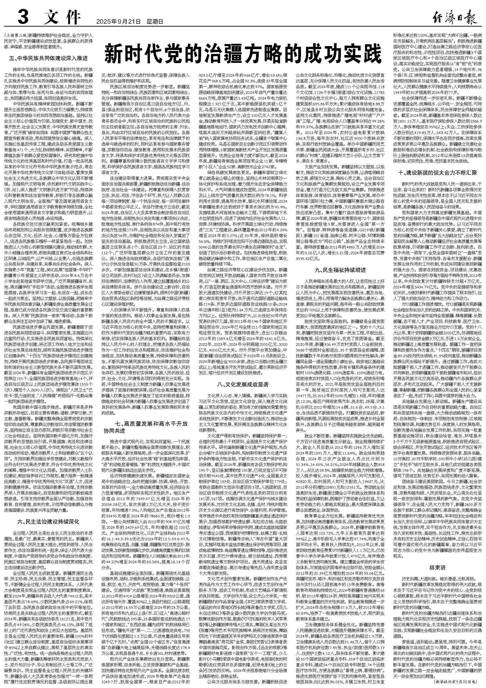 推进中国式现代化、实现共同富裕,一个民族都不能少。新疆完整准确全面贯彻新发展理念,积极服务和融入新发展格局,进一步全面深化改革、扩大高水平开放,经济社会发展“稳”的基础更加牢固、“进”的动能显著增强、“新”的质效大幅提升,中国式现代化新疆实践迈出坚实步伐。