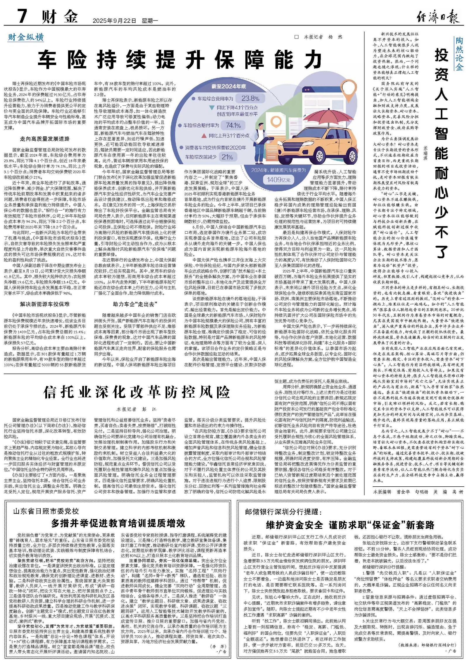 瑞士再保险近期发布的《中国车险市场现状报告》显示,车险作为中国规模最大的非寿险业务,2024年的保费超过9130亿元,占非寿险总保费收入的54%以上。车险行业持续提升经营能力,致力于为消费者提供更公平的定价与更全面的风险保障。车险行业还能够引导汽车制造企业提升车辆安全与性能标准,甚至成为中国汽车品牌开拓国际市场的重要支撑。