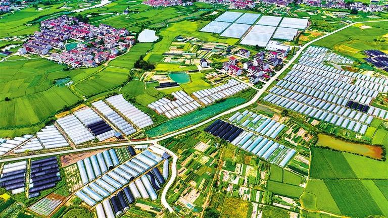 近日,在江西省抚州市崇仁县一家现代农业产业园,蔬菜大棚与田园、民居、山峦交相辉映,勾勒出一幅“乡村美、产业兴”的蓬勃发展画卷。 戴庆福摄(中经视觉)