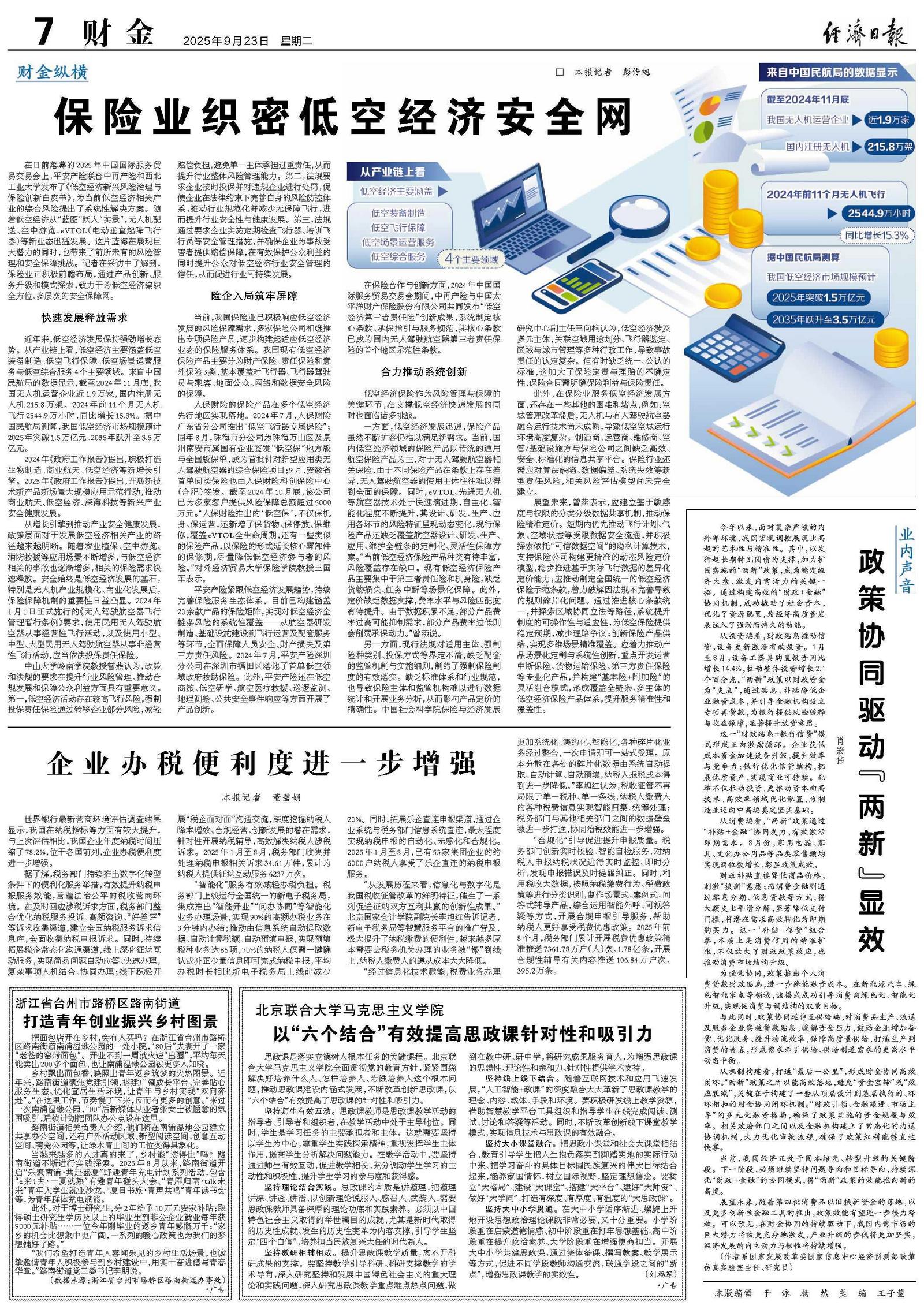 展望未来,曾燕表示,应建立基于敏感度与权限的分类分级数据共享机制,推动保险精准定价。短期内优先推动飞行计划、气象、空域状态等受限数据安全流通,并积极探索依托“可信数据空间”的隐私计算技术,支持保险公司构建更精准的动态风险定价模型,稳步推进基于实际飞行数据的差异化定价能力;应推动制定全国统一的低空经济保险示范条款,着力破解因法规不完善导致的规则碎片化问题。通过推进核心条款统一,并探索区域协同立法等路径,系统提升制度的可操作性与适应性,为低空保险提供稳定预期,减少理赔争议;创新保险产品供给,实现多维场景精准覆盖。应着力推动产品场景化定制与系统性创新,重点开发运营中断保险、货物运输保险、第三方责任保险等专业化产品,并构建“基本险+附加险”的灵活组合模式,形成覆盖全链条、多主体的低空经济保险产品体系,提升服务精准性和覆盖性。