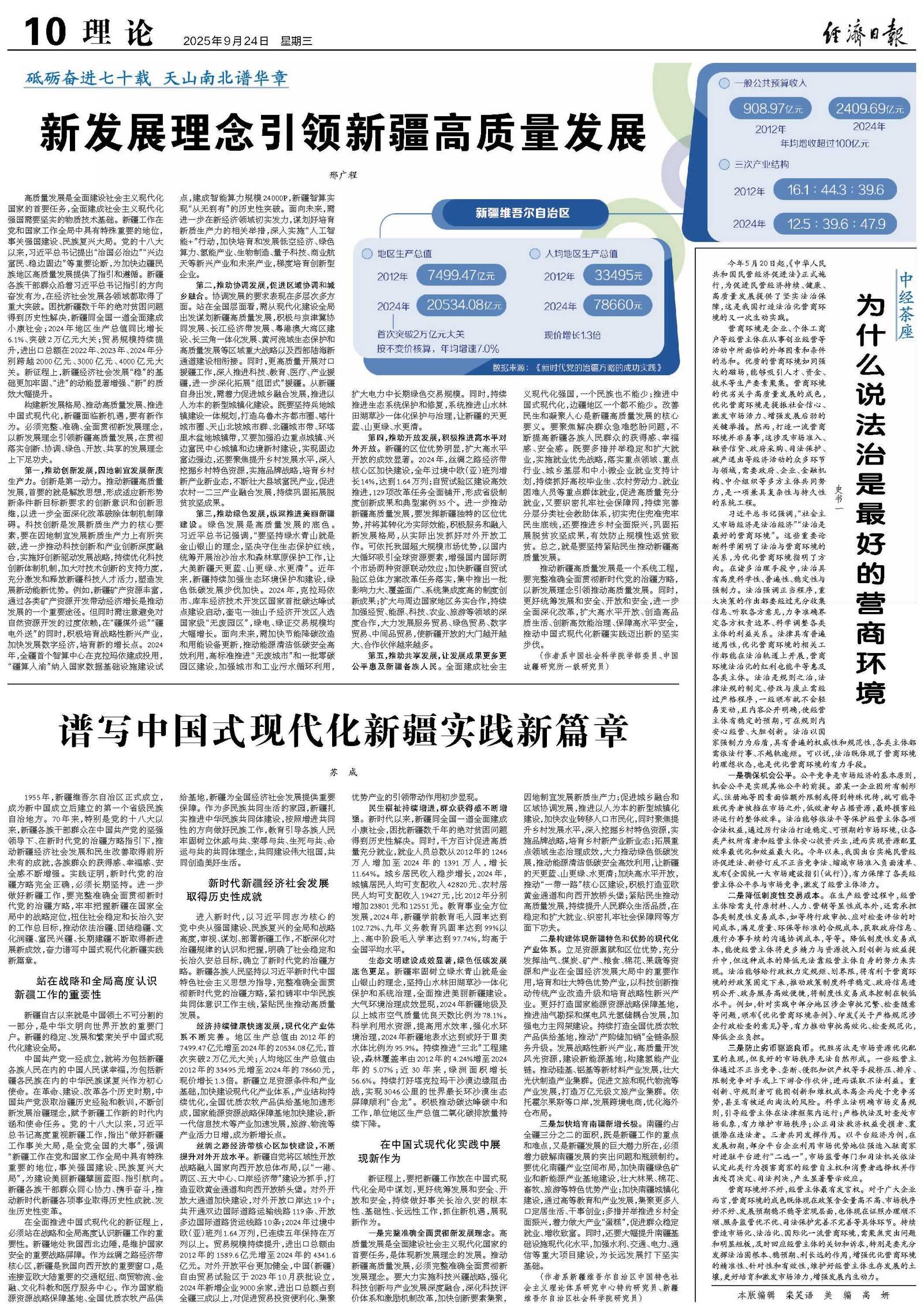 高质量发展是全面建设社会主义现代化国家的首要任务,全面建成社会主义现代化强国需要坚实的物质技术基础。新疆工作在党和国家工作全局中具有特殊重要的地位,事关强国建设、民族复兴大局。党的十八大以来,习近平总书记提出“治国必治边”“兴边富民、稳边固边”等重要论断,为加快边疆民族地区高质量发展提供了指引和遵循。新疆各族干部群众沿着习近平总书记指引的方向奋发有为,在经济社会发展各领域都取得了重大突破。困扰新疆数千年的绝对贫困问题得到历史性解决,新疆同全国一道全面建成小康社会;2024年地区生产总值同比增长6.1%、突破2万亿元大关;贸易规模持续提升,进出口总额在2022年、2023年、2024年分别跨越2000亿元、3000亿元、4000亿元大关。新征程上,新疆经济社会发展“稳”的基础更加牢固、“进”的动能显著增强、“新”的质效大幅提升。