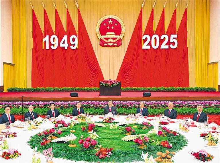 人民大会堂宴会厅华灯璀璨,洋溢着喜庆热烈的节日氛围。主席台上方高悬着庄严的国徽,“1949-2025”大字年号在鲜艳红旗映衬下格外醒目。