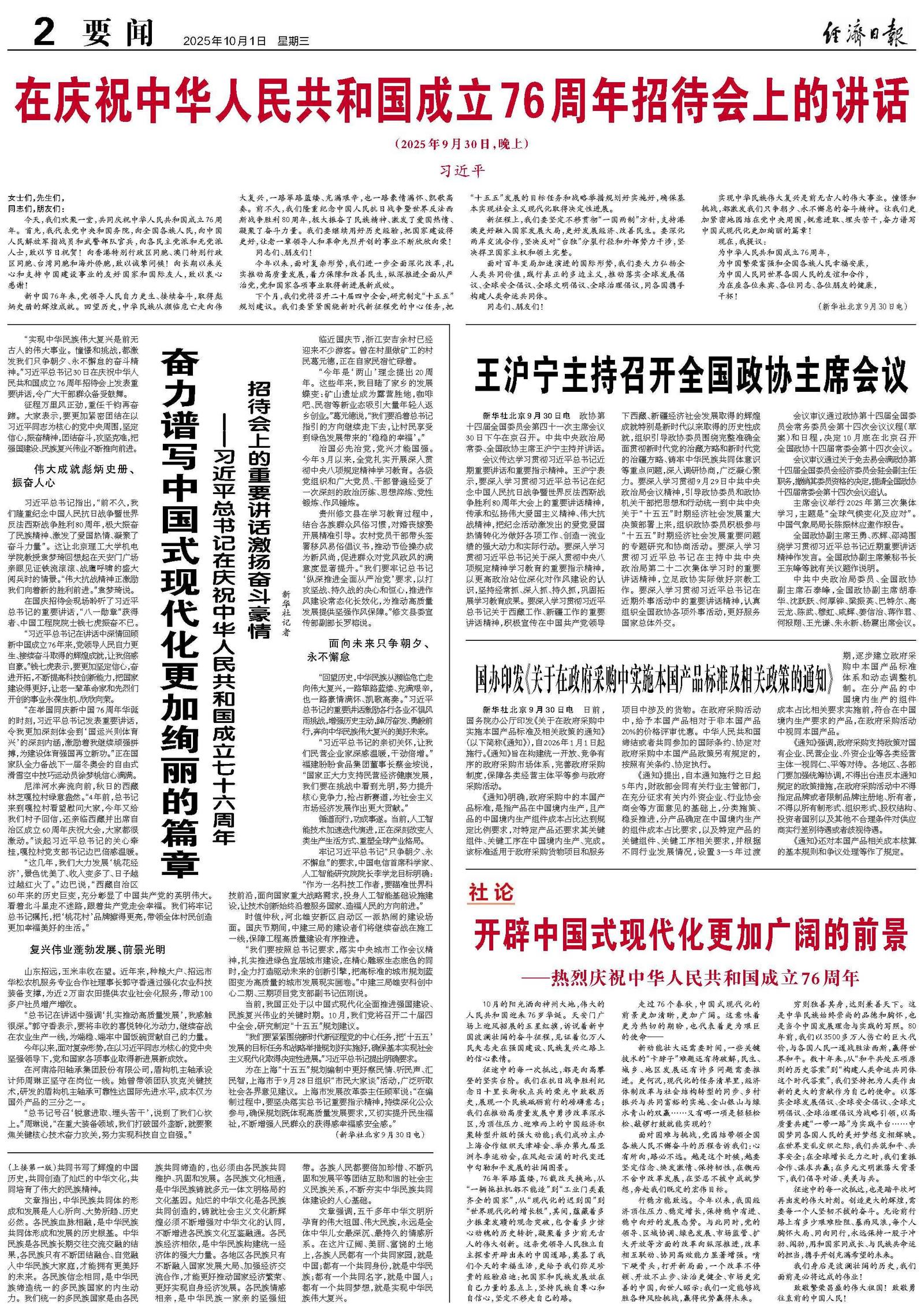 今天,我们欢聚一堂,共同庆祝中华人民共和国成立76周年。首先,我代表党中央和国务院,向全国各族人民,向中国人民解放军指战员和武警部队官兵,向各民主党派和无党派人士,致以节日祝贺!向香港特别行政区同胞、澳门特别行政区同胞、台湾同胞和海外侨胞,致以诚挚问候!向长期以来关心和支持中国建设事业的友好国家和国际友人,致以衷心感谢!