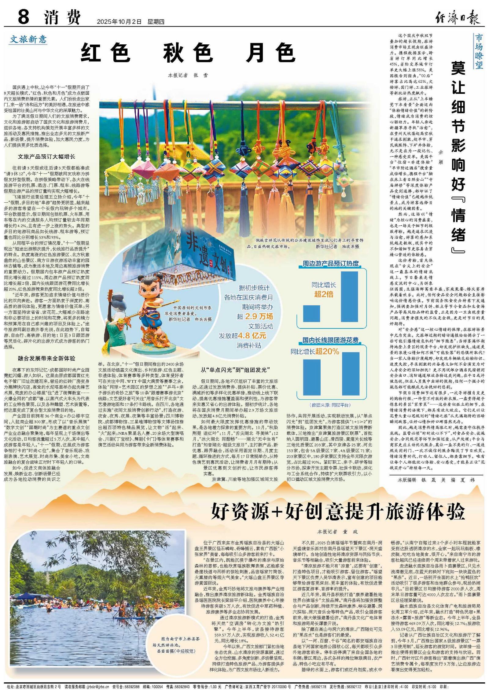 记者从广西壮族自治区文化和旅游厅了解到,今年3月,广西推出国家A级旅游景区“一票3日使用制”,延长游客的游览时间。该举措一经推出便得到景区企业和游客的支持与欢迎。同时,广西针对区外游客推出“跟着演出游广西”演艺消费专属卡,每季度发行3万张,让边旅游边看演出变得更加轻松。
