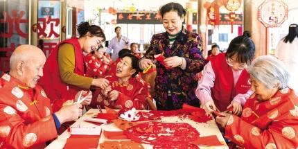 1月20日,内蒙古自治区呼和浩特市玉泉区民政局,志愿者与老年人一起剪窗花,迎新春。数据显示,我国基本养老保险参保率稳定保持在95%以上。丁根厚摄(中经视觉)