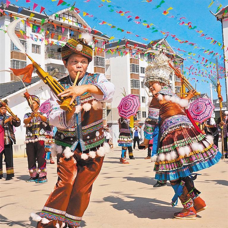 广西壮族自治区融水苗族自治县融水镇苗美家园社区,居民载歌载舞庆祝搬迁五周年。该易地扶贫搬迁点共安置了来自全县20个乡镇的6000多名各族群众(摄于2024年11月10日)。龙林智摄(中经视觉)